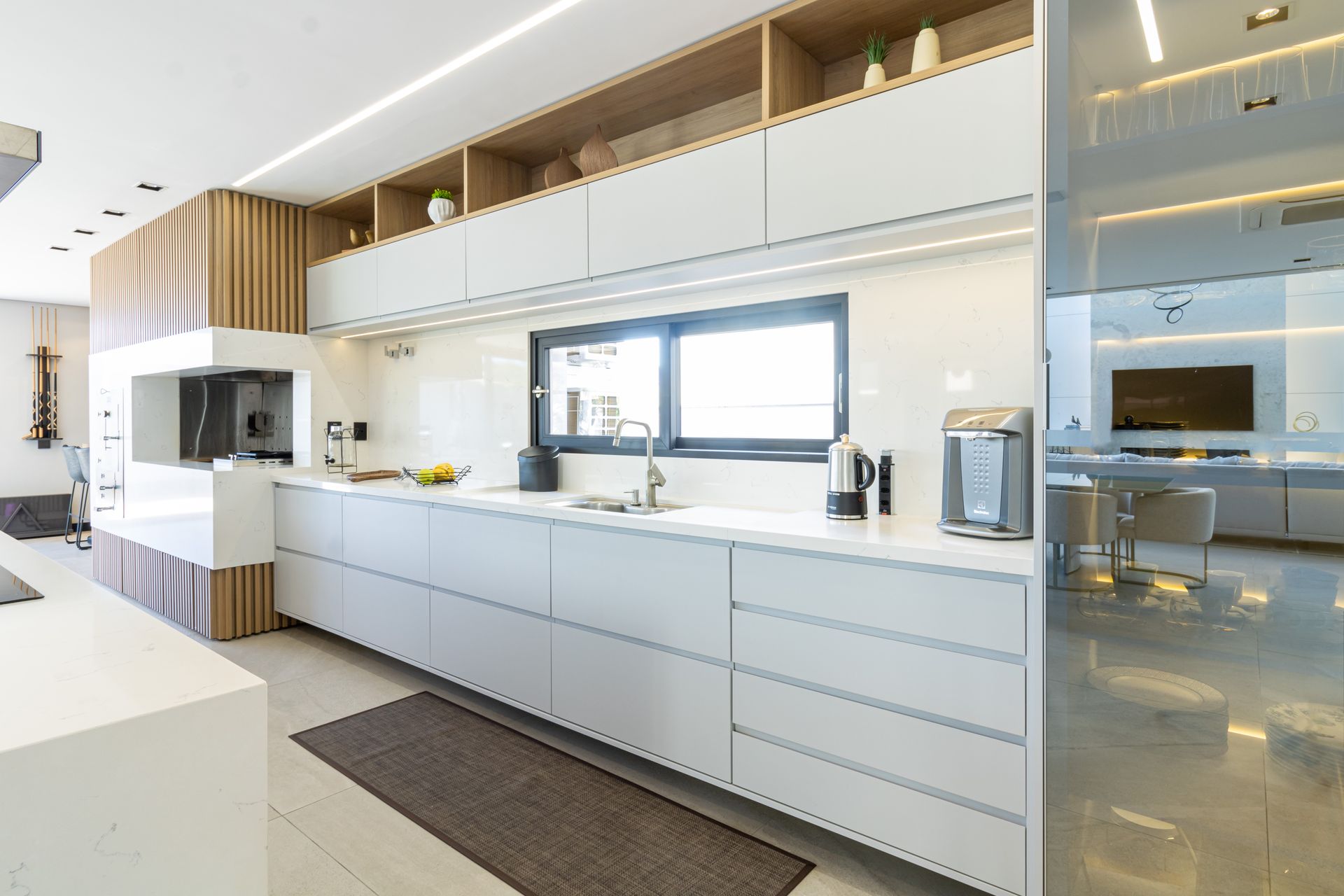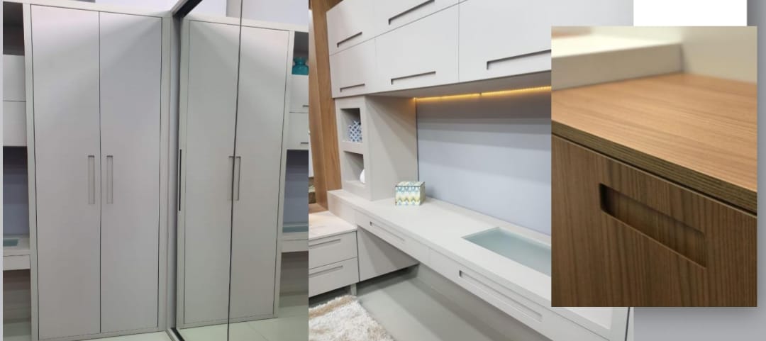 Metalon, portas em vidro, laca, palha, ripado, organizador interno para gavetas, puxador cava, LED.